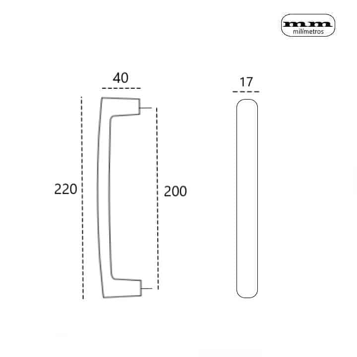 -Material: Latón. -Acabados: Latón Mate (Dorado) / Pulido Brillo (Dorado) / Níquel Mate. -Medidas: 220x17x40mm (200mm entre centros/ejes). -Fijaciones ocultas. -Incluye 1 Manillón sin roseta + tornillos de Sujeción.