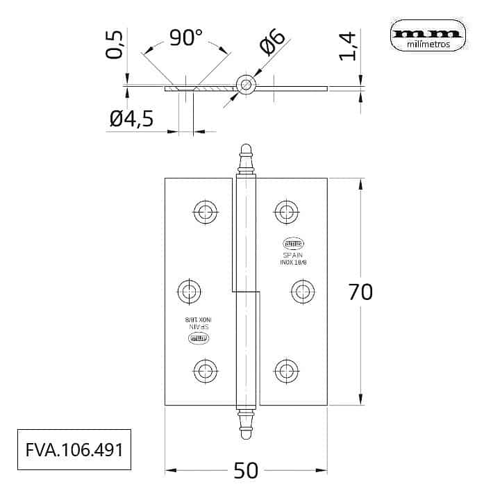 -Material: Acero Inoxidable AISI 304 (18/8). -Acabado: Inox Mate. -Mano Apertura: Izquierda. -Medidas: 60x40x1,5mm / 70x50x1,5mm. -Con remate. -Canto Cuadrado. -Incluye 1 Bisagra.