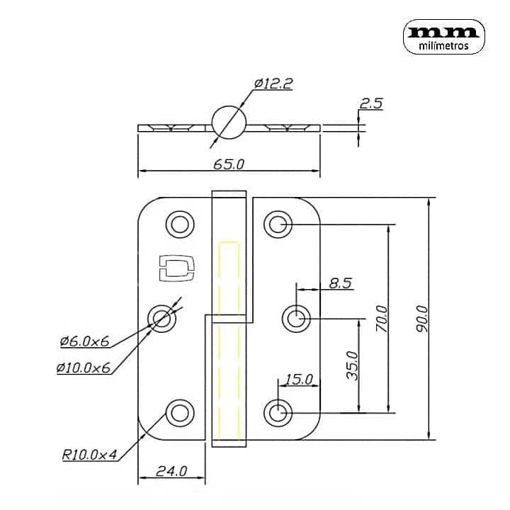 -Material: Acero Inoxidable. -Acabado: Latón Mate (Dorado) / Negro / Blanco. -Mano Apertura: Izquierda / Derecha. -Medida: 90x65x2.5mm. -Incluye 1 Pernio.