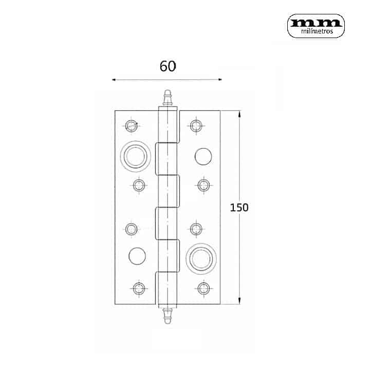 Bisagra de seguridad con dos rodamientos, remate y pasador extraíble inox para puertas.