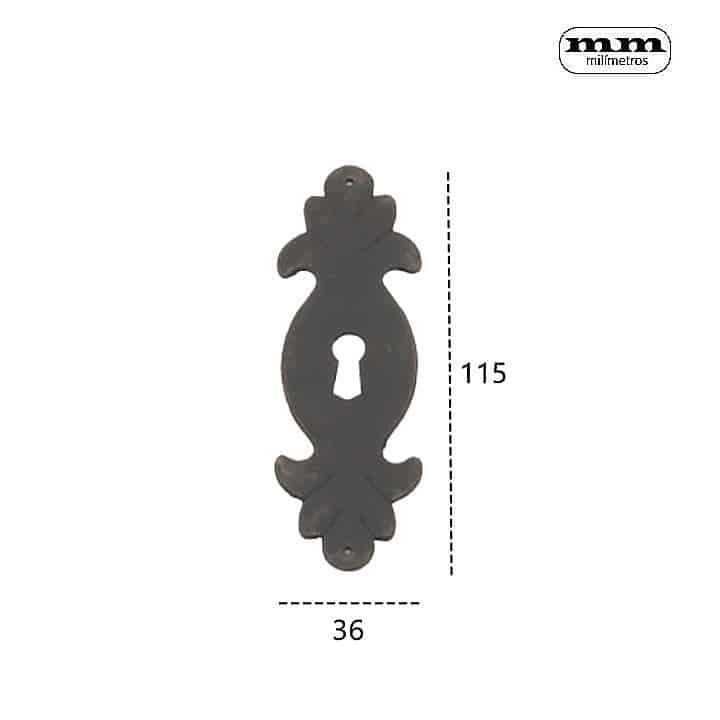 -Material. Hierro Tratado. -Acabado: Oxidado -Medidas: 115x36mm. -Incluye 1 Bocallave.