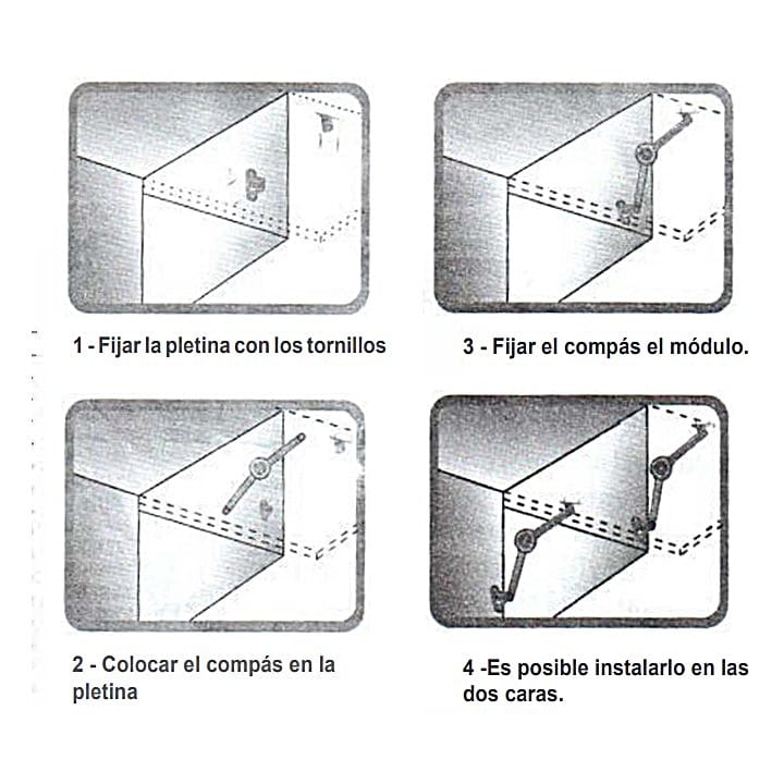 Soporte Brazo de Sujeción en forma de Compás Elevable, para puertas de muebles abatibles Ascendentes.