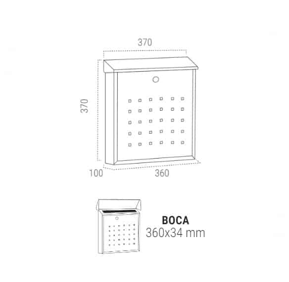 -Medidas Buzón: 370x360x100mm -Boca: 350x34mm (Formato Revista). -Incluye tornillería. -Abertura hacia abajo.