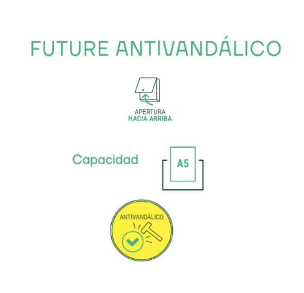 •Antivandálico: Puerta de 1 mm. de espesor y forma curva que acentúa la robustez. Sistema de giro mediante varilla de alta resistencia.