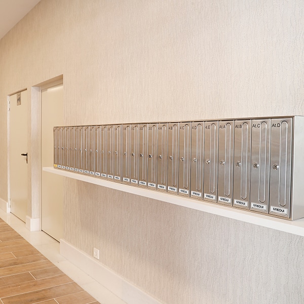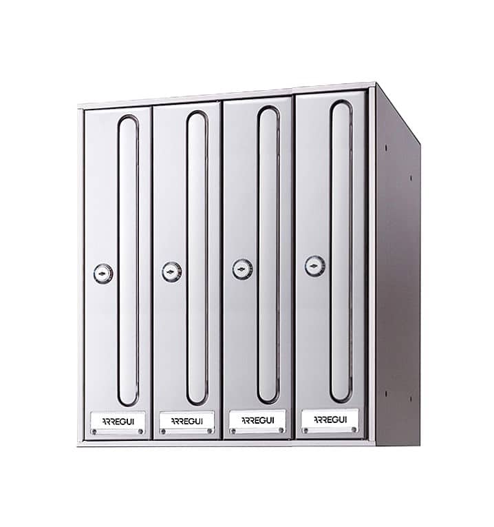 Grupo de 4 Buzones Verticales colocados en Batería para comunidades, modelo Front Vertical (V1640). Adecuado para su colocación en INTERIOR.