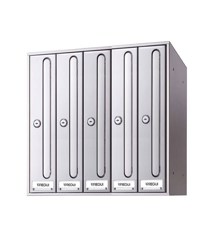 Grupo de 5 Buzones Verticales colocados en Batería para comunidades, modelo Front Vertical (V1650). Adecuado para su colocación en INTERIOR.