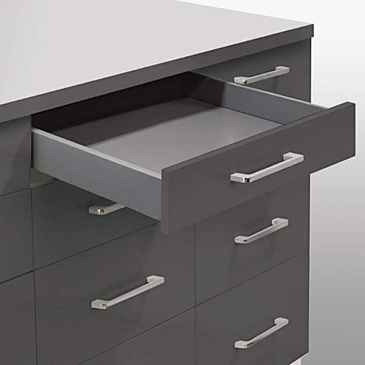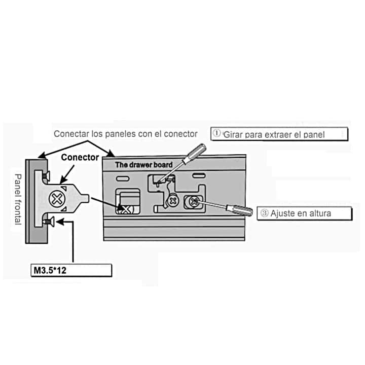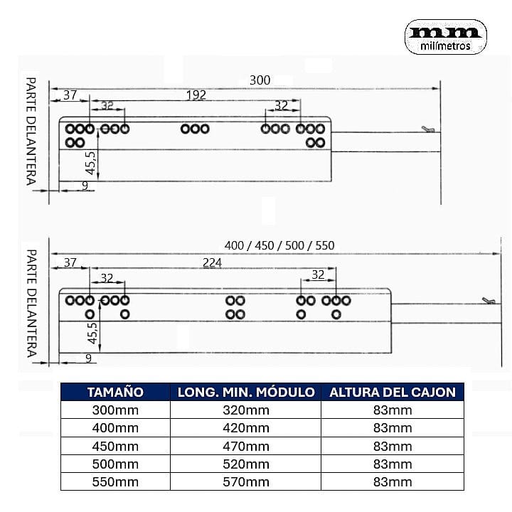 -Acabado/Color: Gris. -Altura de los costados: 83mm. -Medidas (Largo de las Guías) : 300mm / 400mm / 450mm / 500mm / 550mm. -Cierre Suave. -Ajustable.+/- 3mm izquierda-derecha en el panel frontal. -Fácil Montaje y desmontaje del cajón. -Componentes: 2 Paneles laterales, 2 conectores traseros, 2 tapetas laterales y 2 Guías de Cajón.