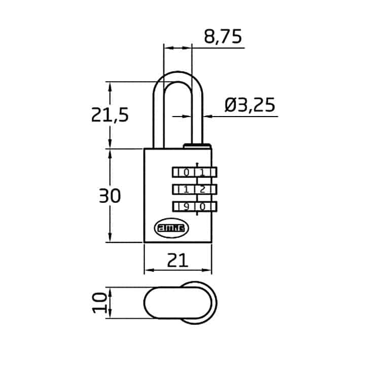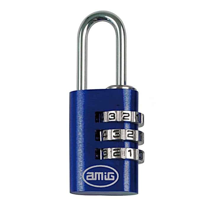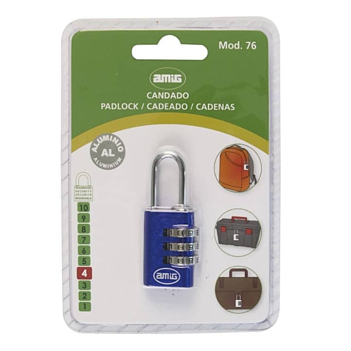 Candado de combinación de aluminio compacto con sistema de combinación reprogramable de 3 dígitos. Ligero y con gran resistencia a la corrosión.