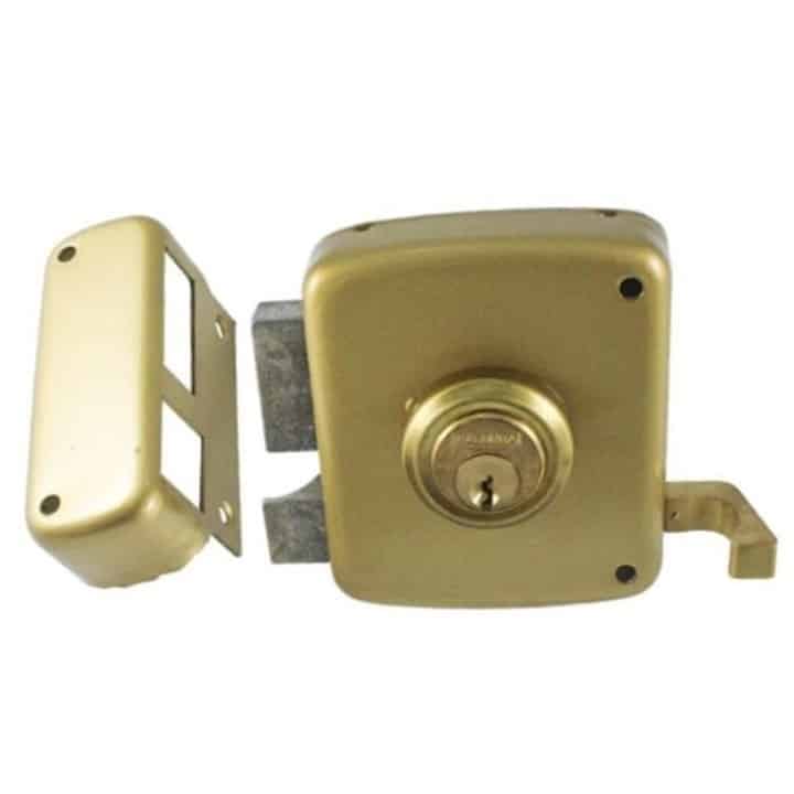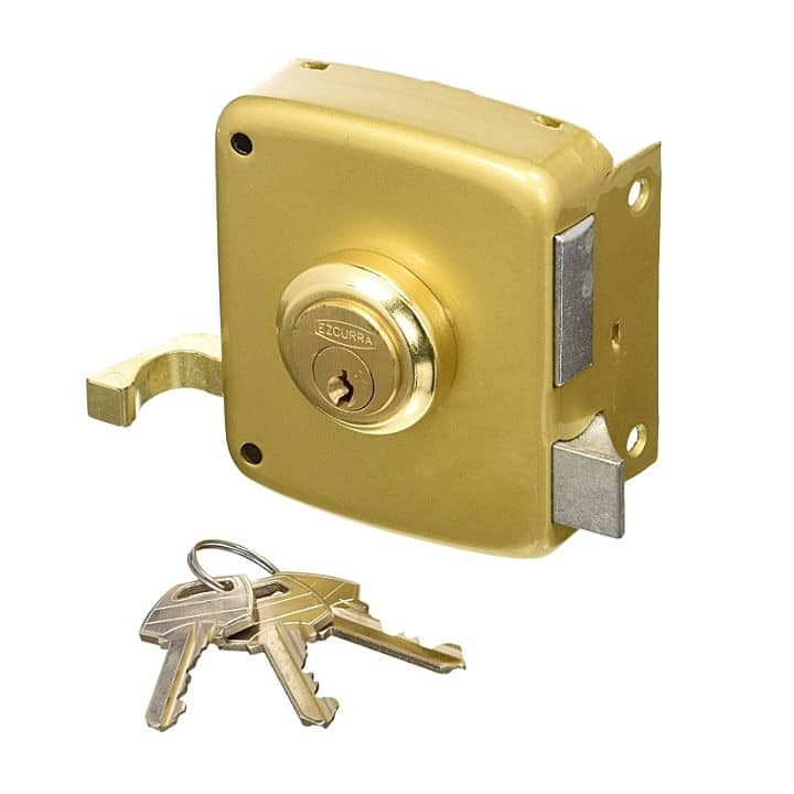 Cerradura de sobreponer con doble cilindro, cerradero y escudo.