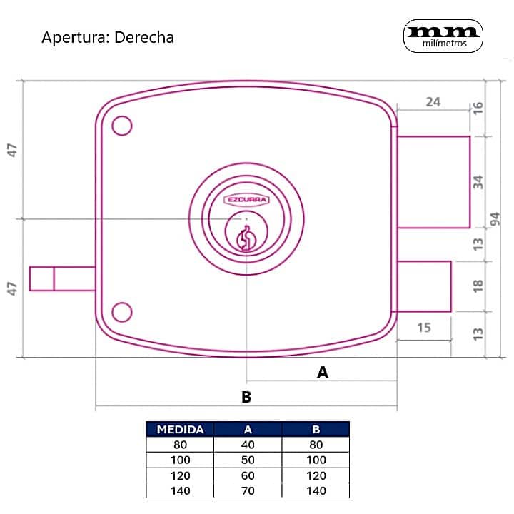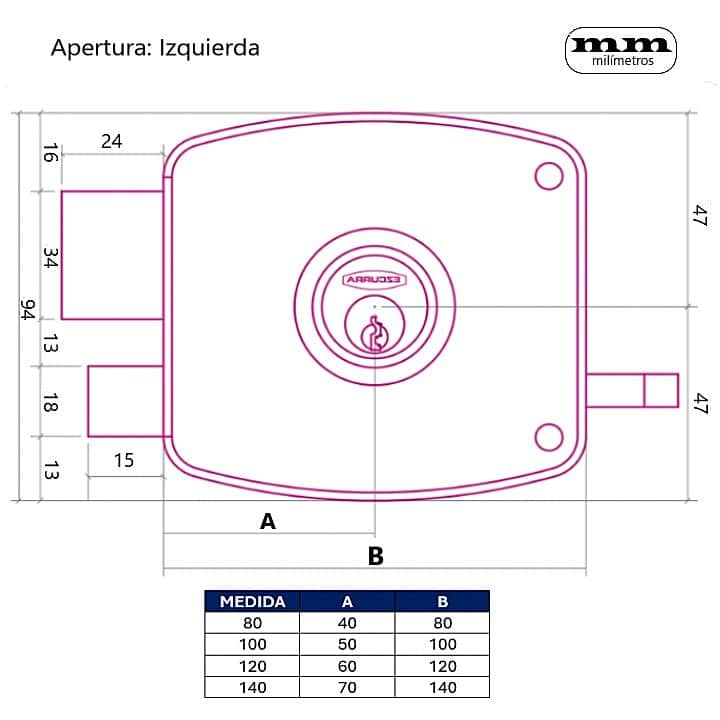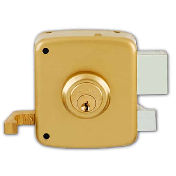 -Material: Acero. -Acabado: Esmaltado oro (Dorado). -Medidas: 80mm (A:40 B:80) / 100mm (A:50 B:100) / 120mm (A:60 B:120) / 140mm (A:70 B:140). -Mano Apertura: Derecha / Izquierda. -Con doble cilindro redondo + 3 Llaves. -Palanca de acero. -Picaporte. -Tirador Interior. -2 vueltas de llave. -Cerradero y Escudo.