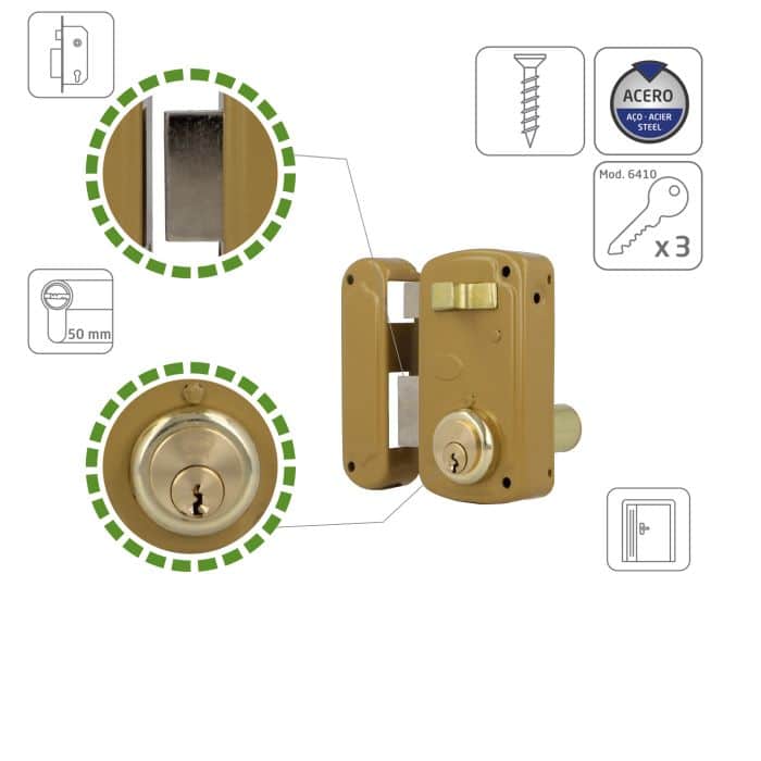CERRADURA DE SOBREPONER ESMALTADO PARA PUERTAS DE MADERA. CILIDNDRO REDONDO DE 50mm.