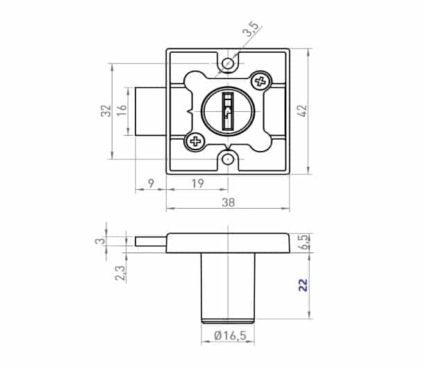CERRADURA DE SOBREPONER PARA MUEBLES. -ACABADO EN NIQUELADO. -DIÁMETRO Ø16,5mm. -LLAVES IGUALES. -APERTURA A MANO DERECHA. — FVA.329.331