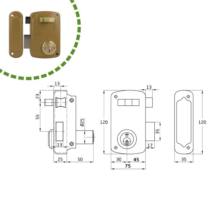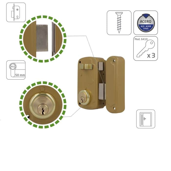 CERRADURA DE SOBREPONER ESMALTADO PARA PUERTAS DE MADERA. CILIDNDRO REDONDO DE 50mm.