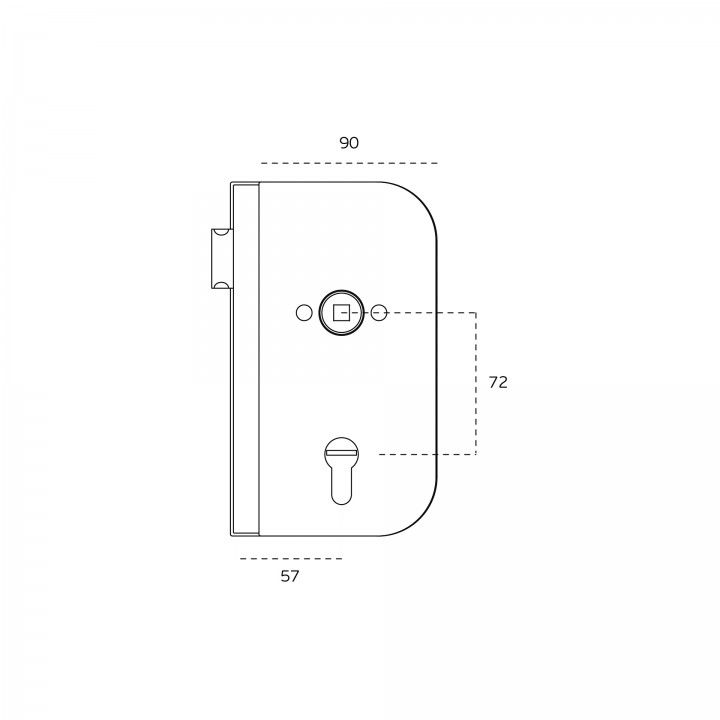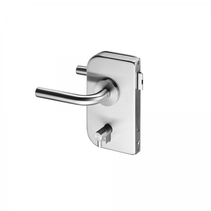 CERRADURA DE BAÑO PARA PUERTAS DE CRISTAL ABATIBLES, CON BOMBILLO DE PERFIL EUROPEO, CON BOTÓN EN UN LADO Y RANURA DE MONEDA DE DESBLOQUEO EN EL OTRO.