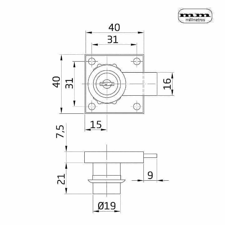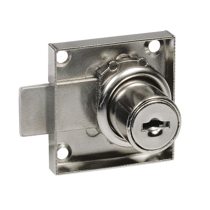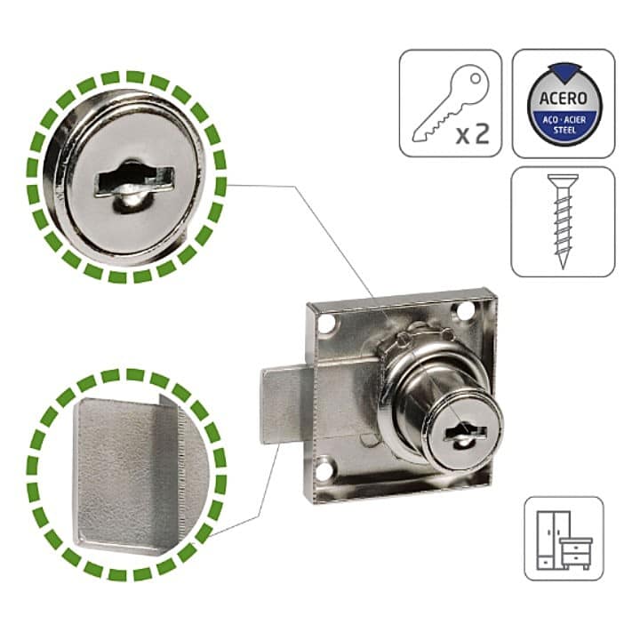 Cerradura de mueble fabricada en acero al carbono de alta calidad niquelada con lengüeta recta de acero niquelada de 16 mm. Diámetro del bombillo 19 mm y anchura máxima: 21 mm. El acero es un material de larga vida útil, que destaca por su dureza, resistencia a la tracción y a la corrosión.