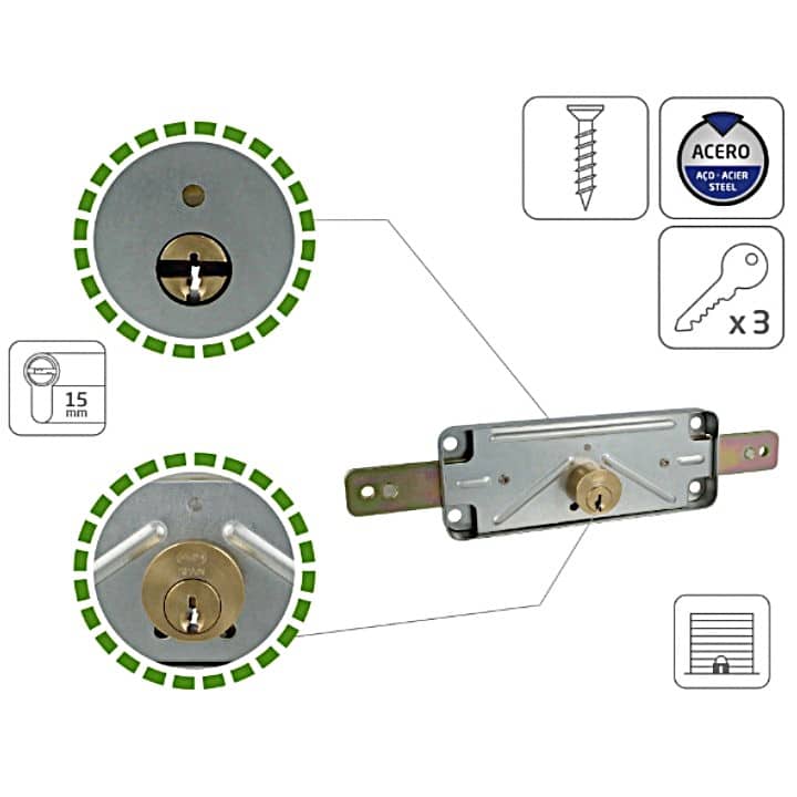 Cerradura para cierre de persianas metálicas enrollables. Este tipo de cerradura se coloca interiormente en persianas metálicas de garaje, almacenes y locales comerciales. Accionamiento interior y exterior, ambos con llave.