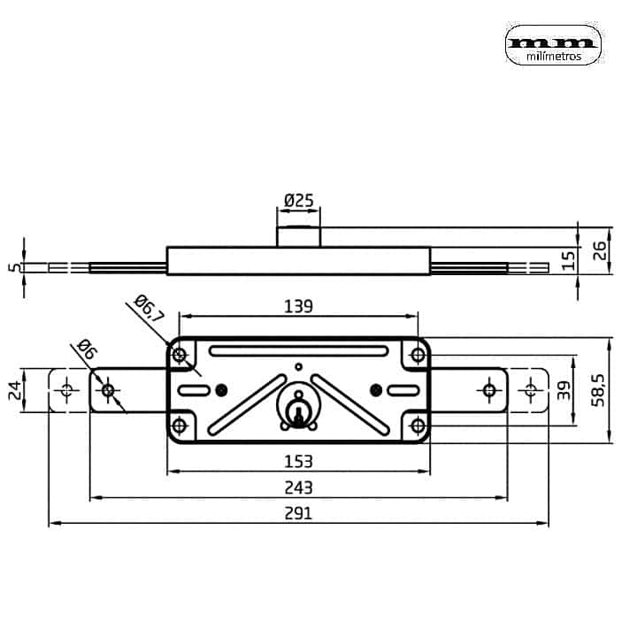 -Medidas: caja de 153 x 58,5 mm; pestañas de cierre de 243 mm con la cerradura abierta o 291 mm si está cerrada.