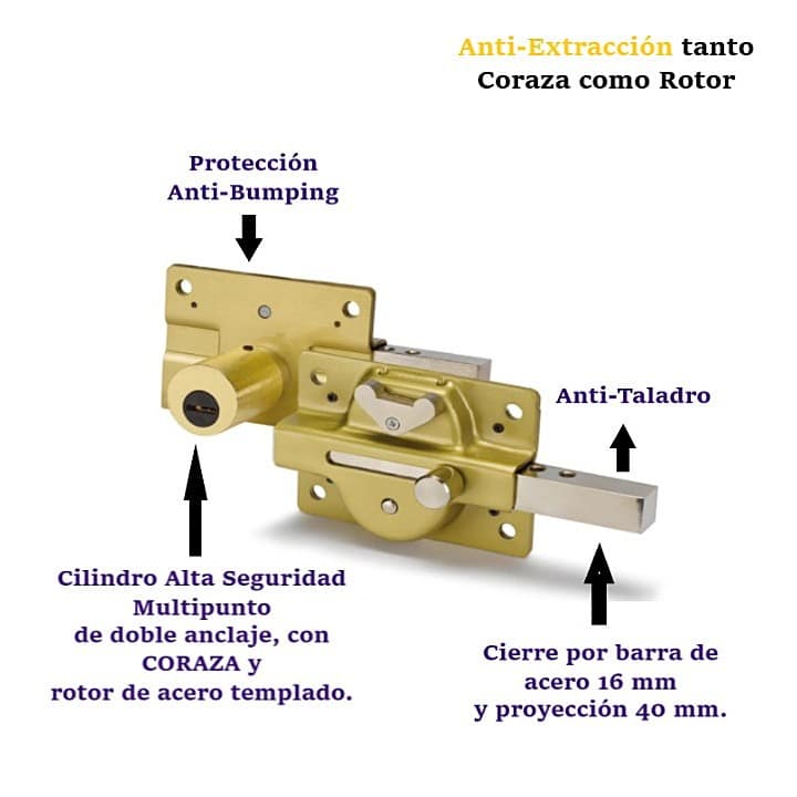 Cerrojo seguridad con Cilindro Multipunto ACORAZADO. Útil en todo tipo de puertas, como cierre individual o como complemento de seguridad en puertas con cerraduras ya incorporadas.