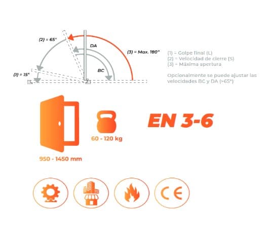 OFRECE UNA AMPLIA GAMA DE USOS PARA PUERTAS ADAPTÁNDOSE HASTA PUERTAS DE 120KG. ES LA SOLUCIÓN IDEAL PARA PUERTAS DE TAMAÑO MEDIO-GRANDE. ADAPTACIÓN ÓPTIMA DE LA VELOCIDAD DE CIERRE CON GOLPE FINAL GRACIAS A DOS VÁLVULAS DE REGULACIÓN.