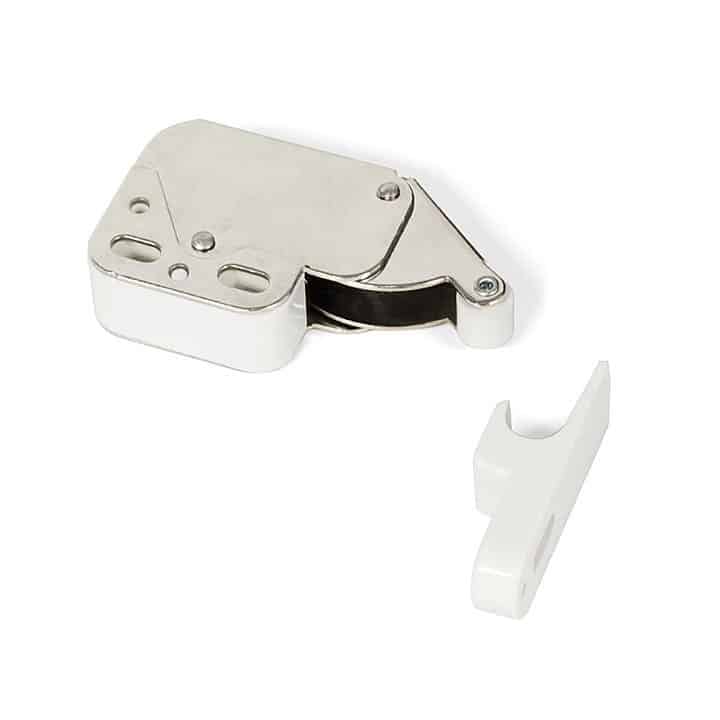 El cierre Push o de Presión, para puertas de Vaiven proporciona un enganche mecánico uniendo la puerta con el mueble. Posee rodamiento de goma que mantiene la puerta cerrada de forma segura. Destaca por su sistema de expulsión de la puerta para apertura automática. Su montaje se realiza atornillado al tablero con una distancia de instalación de 16 mm.