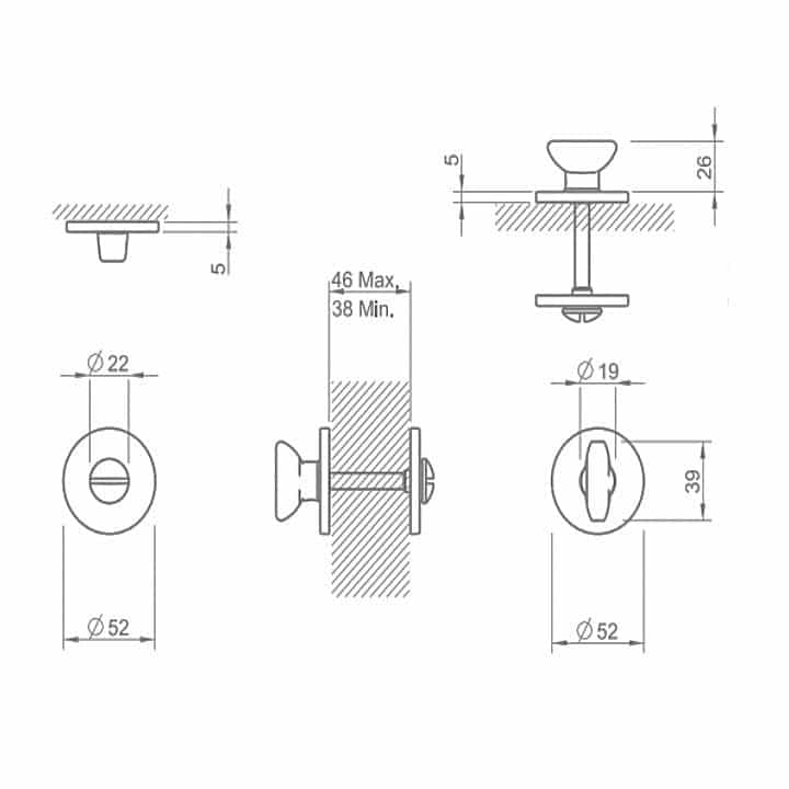 Condena/Cierre para puertas de baño, con hendidura de seguridad para moneda de desbloqueo. Sin indicador de color Libre/Ocupado.