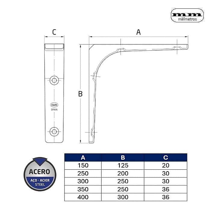 -Material: Acero. -Acabado: Blanco. -Medidas y Peso: 150x125mm (Peso máx. 20Kg) / 250x200mm (Peso máx. 50Kg) / 300x250mm (Peso máx. 50Kg) / 350x250mm (Peso máx. 75Kg) / 400x300mm (Peso máx. 75Kg). -Incluye 1 Escuadra.