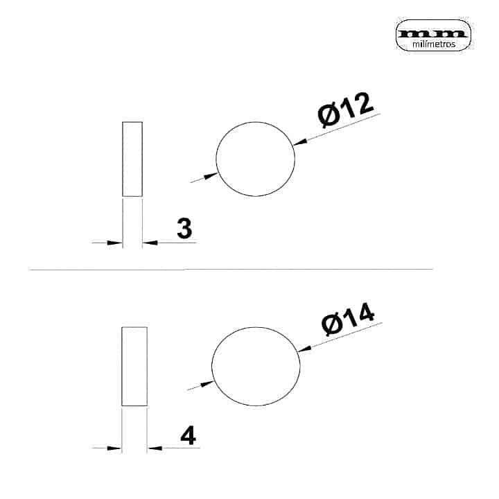 -Material: Neodimio N35. -Acabado: Ni Cu Ni. -Diámetros: Ø12mm (Fuerza 0.5Kg) / Ø14mm (Fuerza 2.5 Kg). -Medida: Ø12x3mm / Ø14x4mm. -Incluye 1 Unidad.
