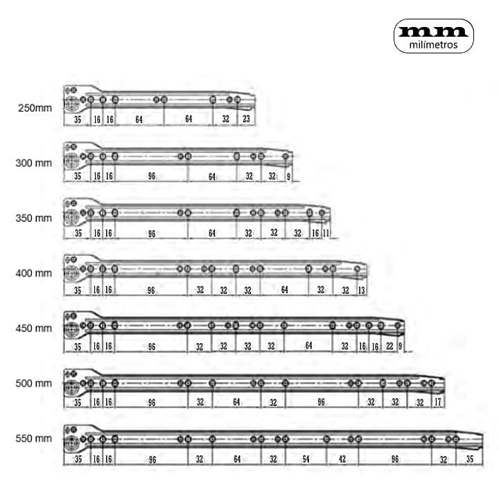 -Material: Acero. -Acabado: Gris Plata RAL 9006. -Medidas: 300mm / 350mm / 400mm / 450mm. -Capacidad de carga: 20Kgs, -Incluye 2 guías para 1 cajón.