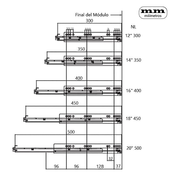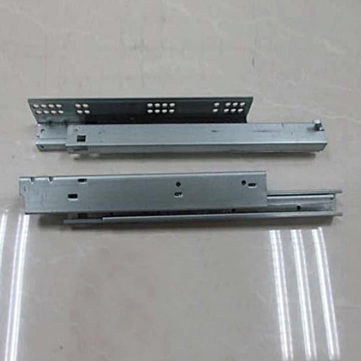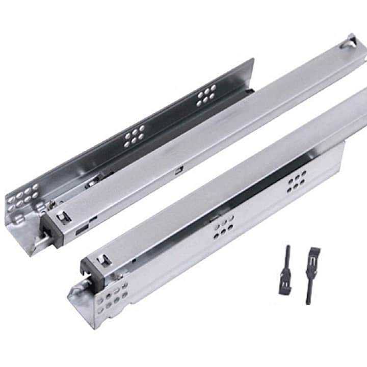 -Material: Acero. -Acabado: Zincado. -Medidas: 300mm / 350mm / 400mm / 450mm / 500mm. -Capacidad de carga: 30Kgs -Cierre Suave (Incorpora un pistón de amortiguación). -Extracción total. -Anticorrosión de alta resistencia. -Incluye 2 guías para 1 cajón.