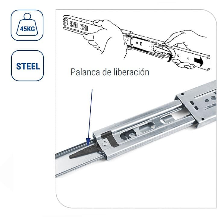 Juego de 2 guías correderas metálicas de extracción total con bolas de acero. Desmontables. Facilitan el deslizamiento y mantienen la alineación durante la apertura y cierre. Acero Zincado anticorrosión de alta resistencia.