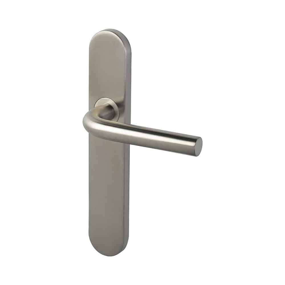 JUEGO DE MANILLA O MANIVELA EN FORMA DE «L» CON PLACA LARGA ACERO INOXIDABLE AISI 304 MEDIDAS: 245X45MM — REF: 367601