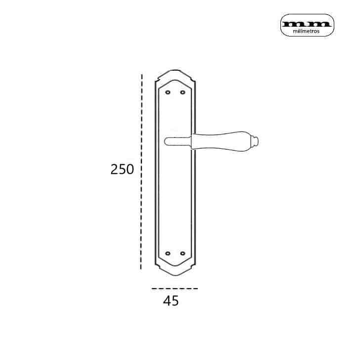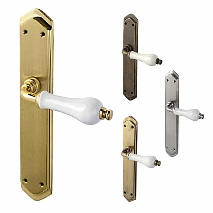 -Material: Latón. -Acabados: Pulido Brillo (Dorado) + Porcelana Blanca / Níquel Satinado + Porcelana Blanca / Cuero Satinado + Porcelana Blanca / Antic + Porcelana Blanca. -Medidas: 250x45mm. -Para cuadradillo de 8mm. -Incluye 2 manillas con roseta (una para cada lado de la puerta) + accesorios para su montaje.