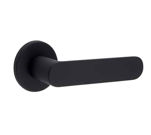 Manivela con roseta redonda de 50mm de diámetro y 5mm de grosor, de línea moderna, para puertas de interior de paso y puertas de entrada, manillas para un uso residencial o público.