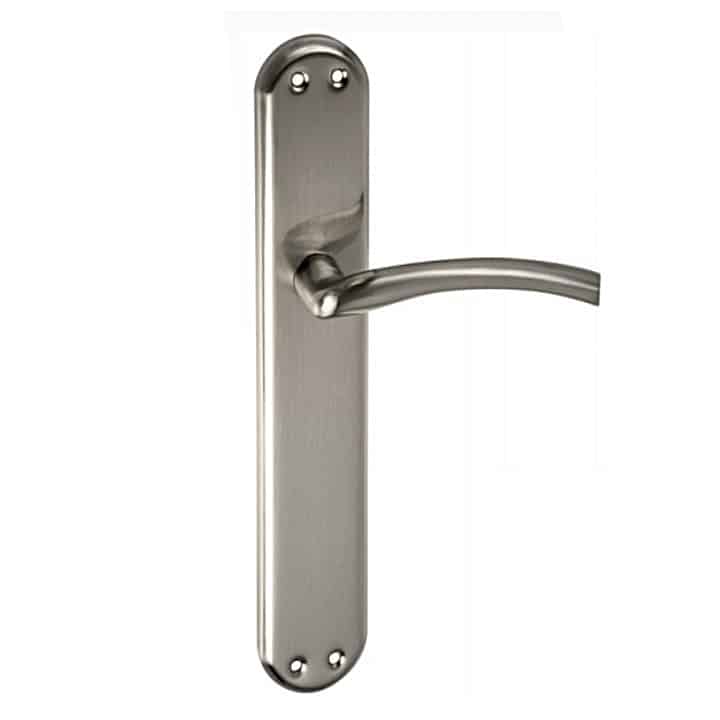 Juego de Manillas con placa ovalada de tornillos vistos, de lineas lisas y estilo clásico, modernizada gracias a su acabado en Níquel Satinado.
