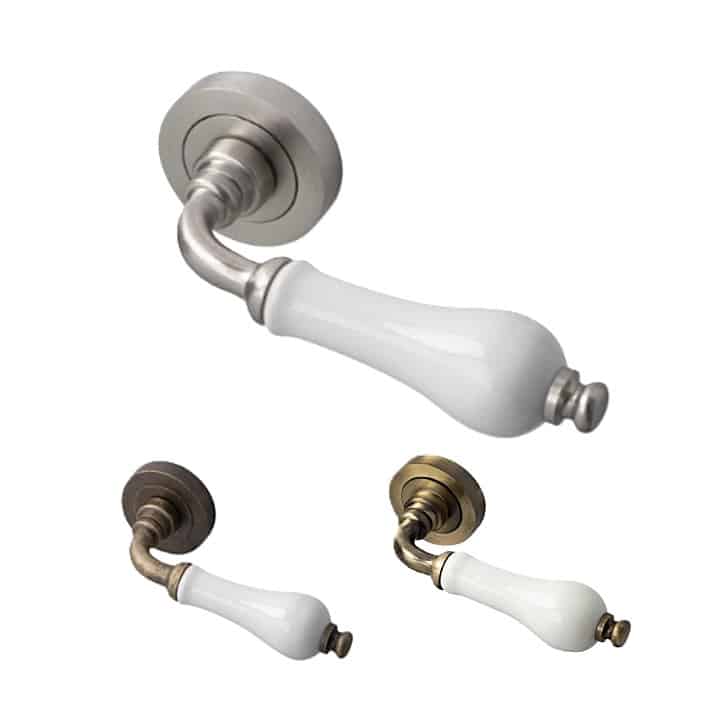 Juego de Manillas con roseta redonda de Ø50mm y empuñadura de Porcelana, de estilo clásico.