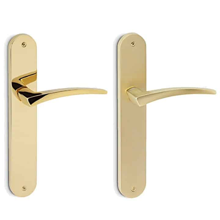 La manilla para puerta de diseño Fey, de estilo geométrico y seductor, se presenta sobre una placa ovalada. Esta manilla de diseño italiano, fabricada en latón estampado de alta calidad, está concebida para puertas de interior y exterior, dando vida y delicadeza a tu puerta.