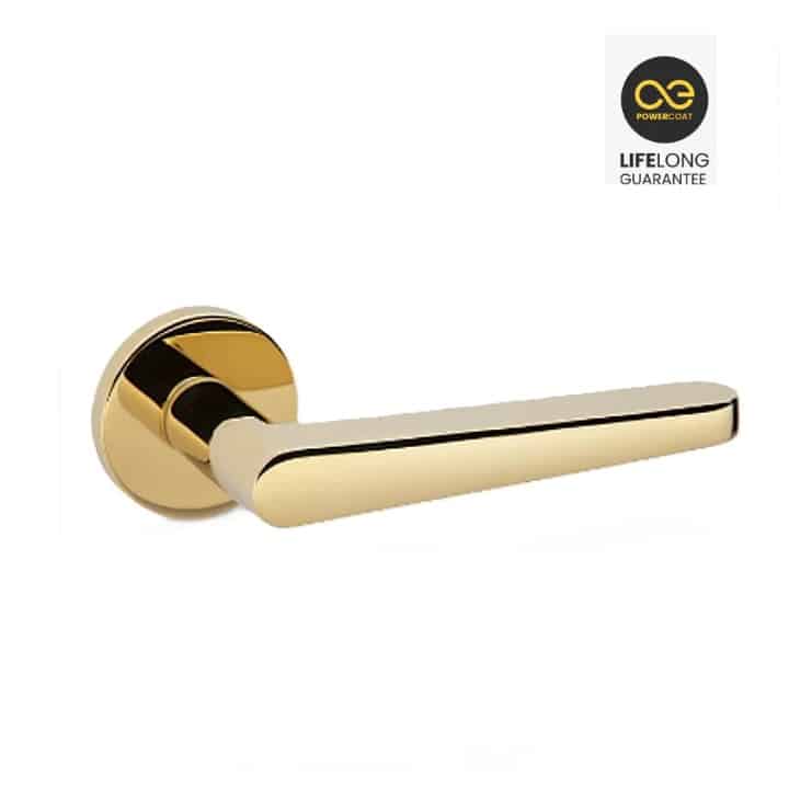 La manilla para puerta de diseño Roby, de puras líneas con ímpetu y firmeza, se presenta sobre una roseta redonda. Esta manilla de diseño italiano, fabricada en latón estampado de alta calidad, está concebida para puertas de interior y exterior, convirtiéndose en un modelo perfecto para ambientes elegantes y minimalistas.
