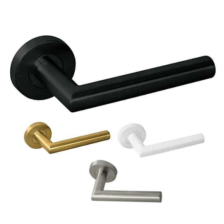 Juego de Manillas Serie Acero 812, de estilo moderno en forma de «L» recta tubular con roseta redonda de Ø53mm.