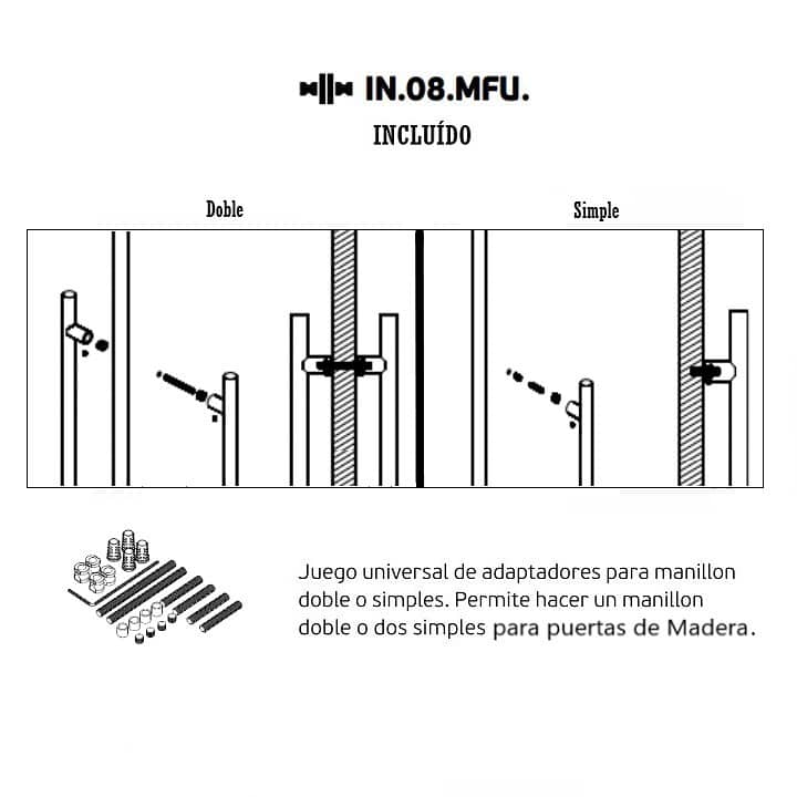 -Incluye 2 Manillones + Juego de Adaptadores (IN.08.MFU) para hacer un manillón doble o dos simples en puertas de Madera.