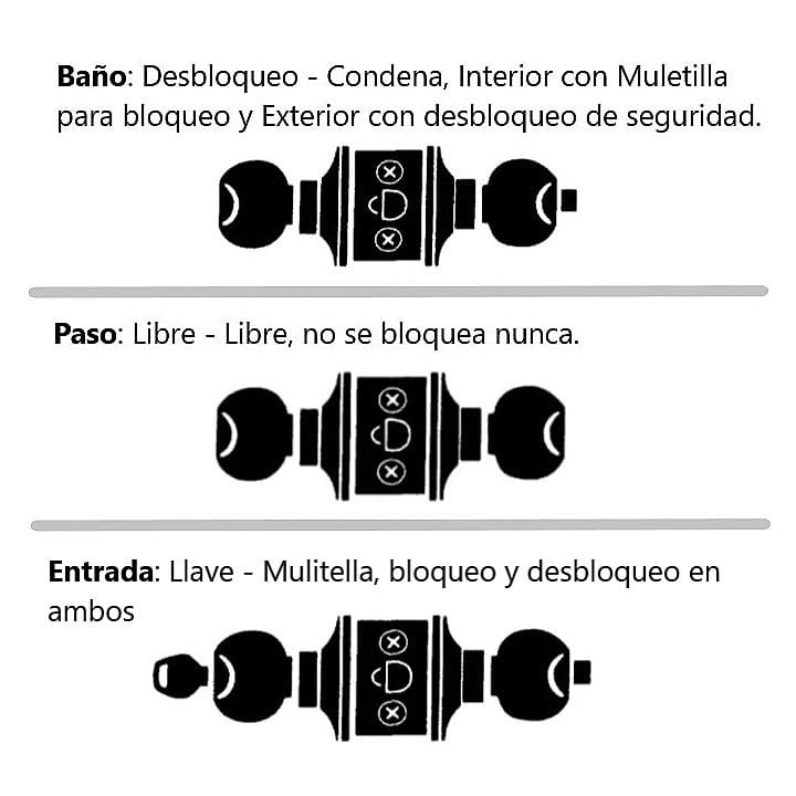 -Función: Paso: (Libre – Libre, no se bloquea nunca) / Baño: (Desbloqueo – condena: Condena Interior con Muletilla para bloqueo y exterior con desbloqueo de seguridad) Entrada: (Llave – Muletilla, Bloqueo y desbloqueo en ambos lados).