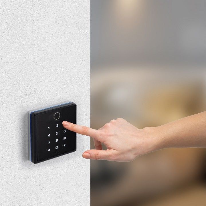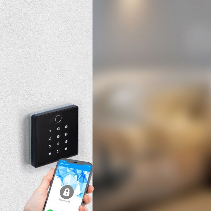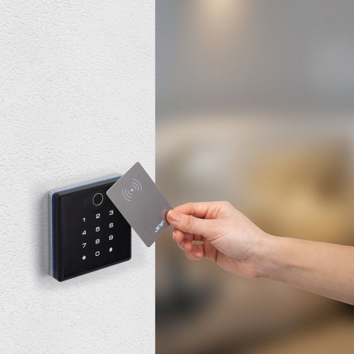 -ESTE CONTROL DE ACCESO DE PARED COMBINA VARIAS TECNOLOGÍAS DE ACCESO, HUELLA DIGITAL, TECLADO NUMÉRICO, LECTOR MIFARE Y BLUETOOTH PARA LA COMUNICACIÓN DE TELÉFONOS MÓVILES A TRAVES DE LAS APLICACIONES PROPORCIONADAS POR JNF.