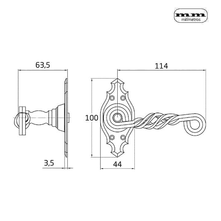 -Material: Zamak (Manilla) / Acero (Placa). -Acabado: Negro. -Para cuadradillo de 8mm. -Medidas: 100x44mm (Ver imagen). -Con placa martilleada de Acero. -Incluye 1 Manilla.