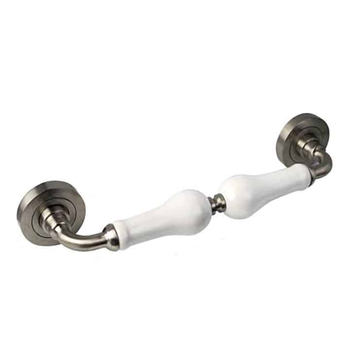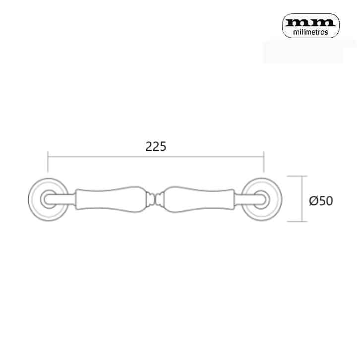 -Material: Latón. -Acabado: Níquel Satinado + Porcelana Blanca. -225mm entre centros/ejes. -Rosetas: Ø50mm. -Fijaciones ocultas. -Incluye 1 Manillón + tornillos de Sujeción.