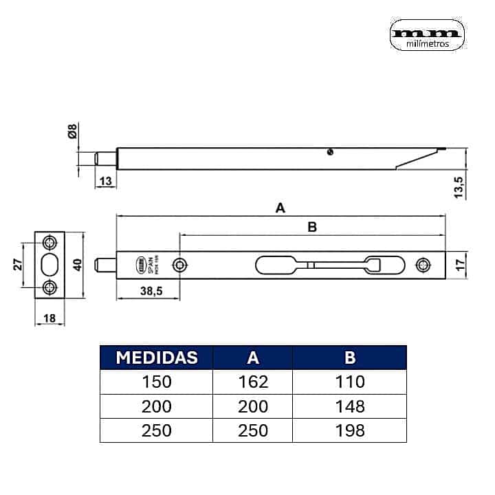 Pasador de embutir para puertas, puertas de doble hoja, ventanas…etc. Canto cuadrado. Anchura: 17 mm. Fácil instalar.