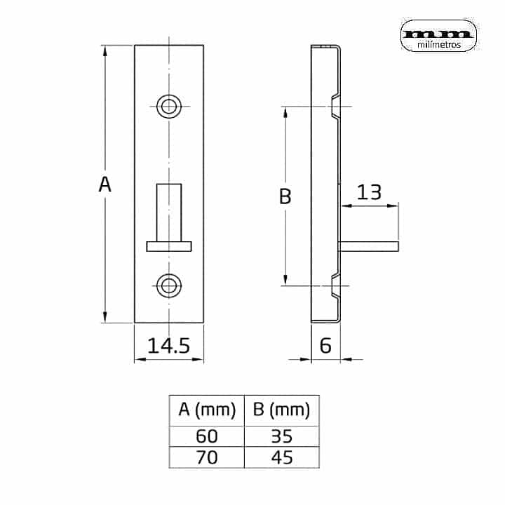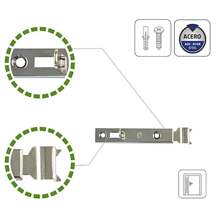 Pasador de sobreponer. Para interior de puertas de armario, etc… Fácil instalar. Instalación mediante fijación con tirafondos.