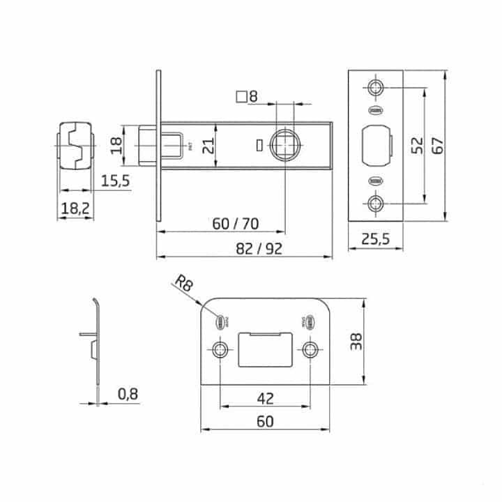 Picaporte de embutir con doble muelle. Frente y el soporte en canto cuadrado. Para manillas con cuadradillo de 8 mm en puertas de madera de paso, AMIG mod. 12.