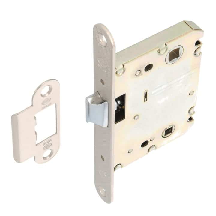 Picaporte unificado de entrada 50 mm con lengüeta reversible. Para manillas de roseta con tornillos pasantes y cuadradillo de 8mm y condenas de 6mm.