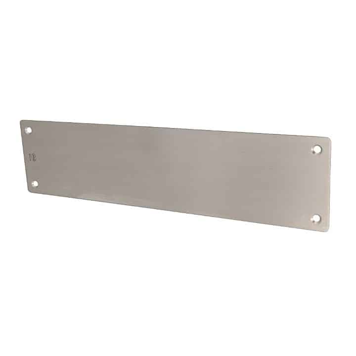 Placa de limpieza con cantos redondos. Alta resistencia a la corrosión y oxidación. Múltiples usos, antihuellas para puertas, para tapar imperfecciones, para proteger frente al roce de llaves o como referencia para empujar la puerta, etc…