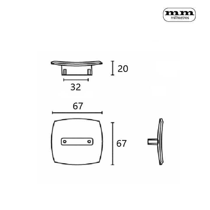 -Material: Zamak. -Acabado: Níquel Seda. -Medida: 67x67mm. -Distancia entre ejes: 32mm -Incluye 1 Pomo.