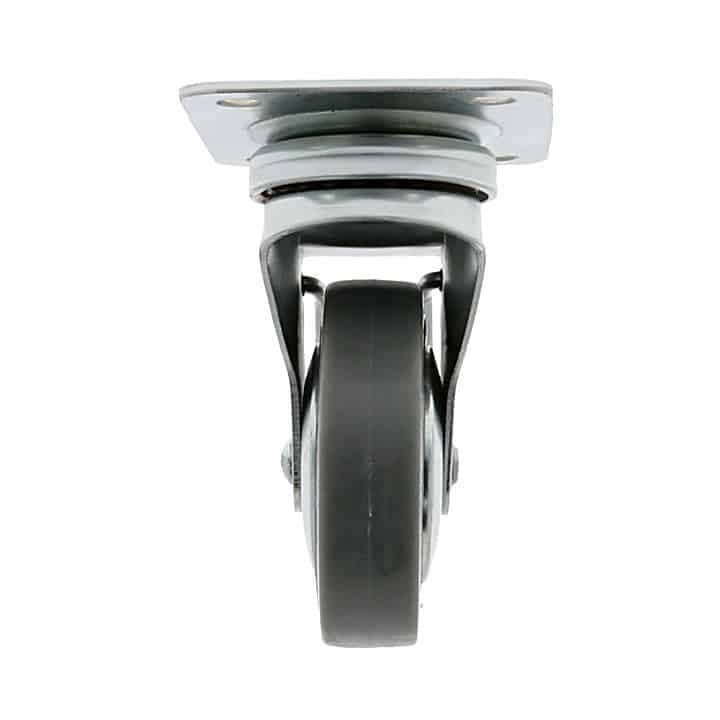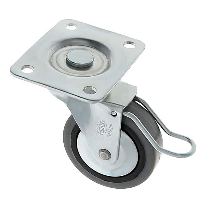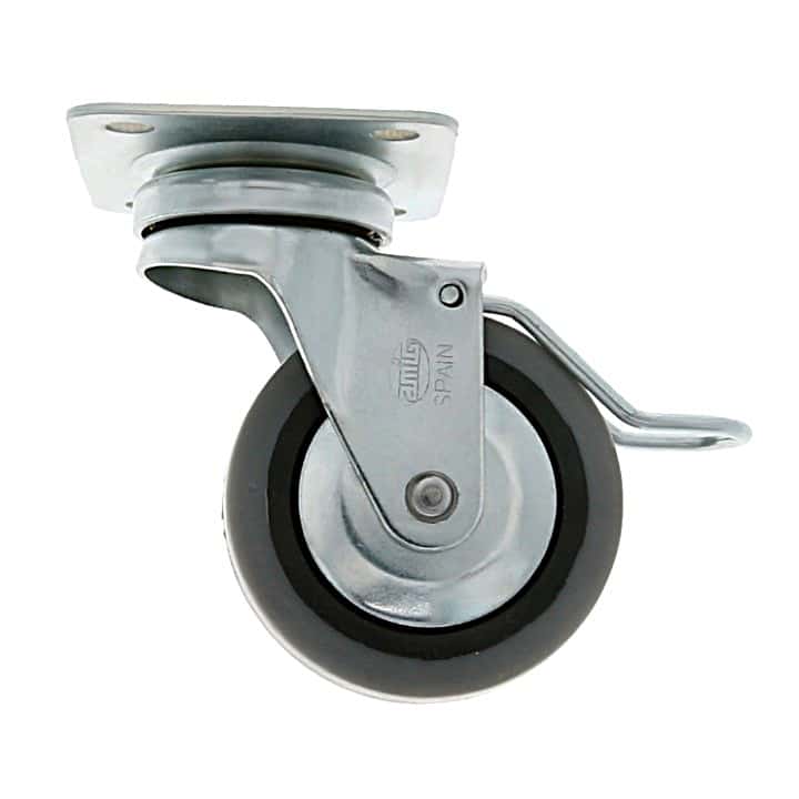 Rueda de goma con pletina y freno. Sistema de fijación con tornillos. Buena resistencia a la abrasión y silenciosa. Uso semi-industrial y mobiliario.